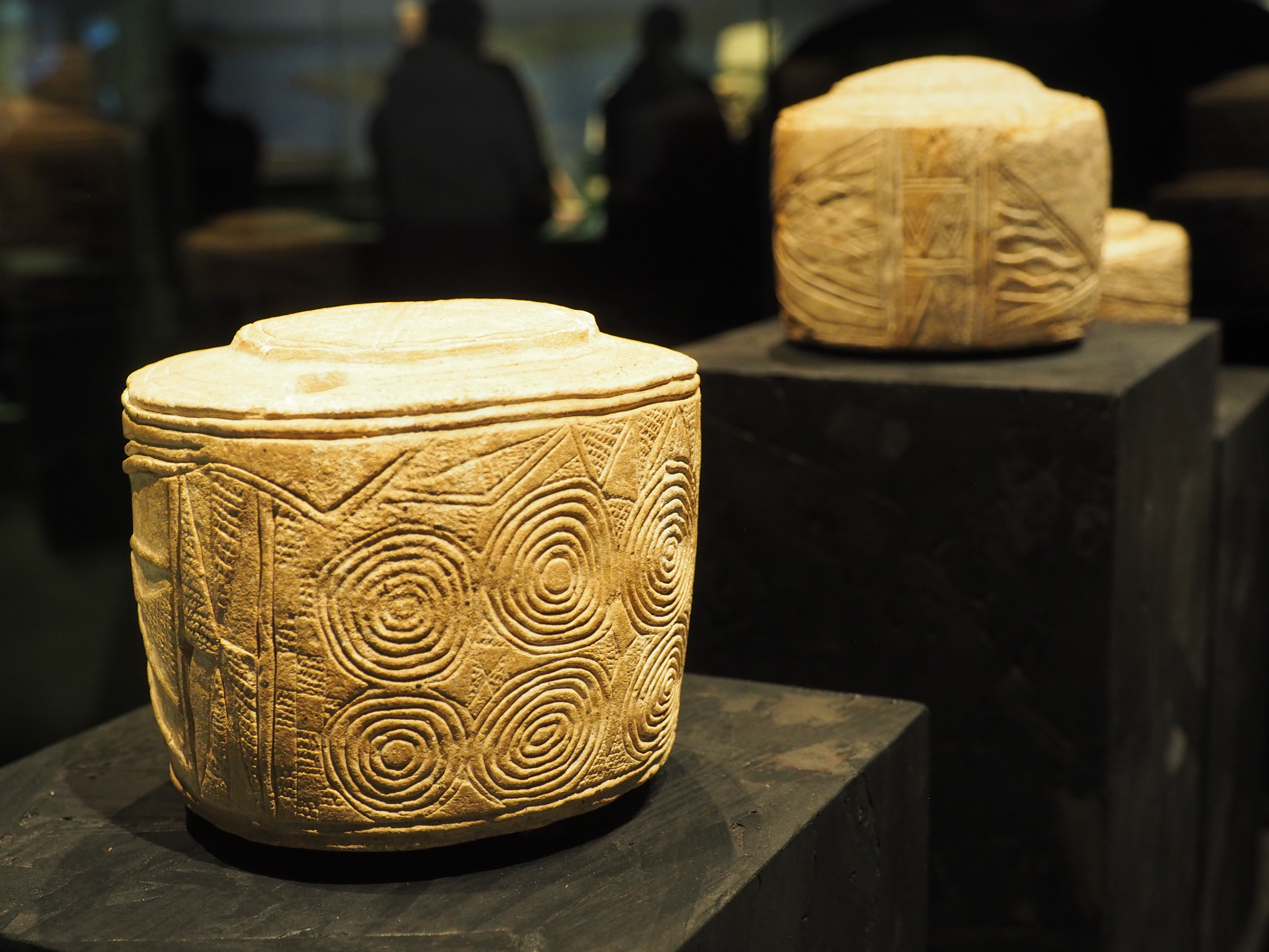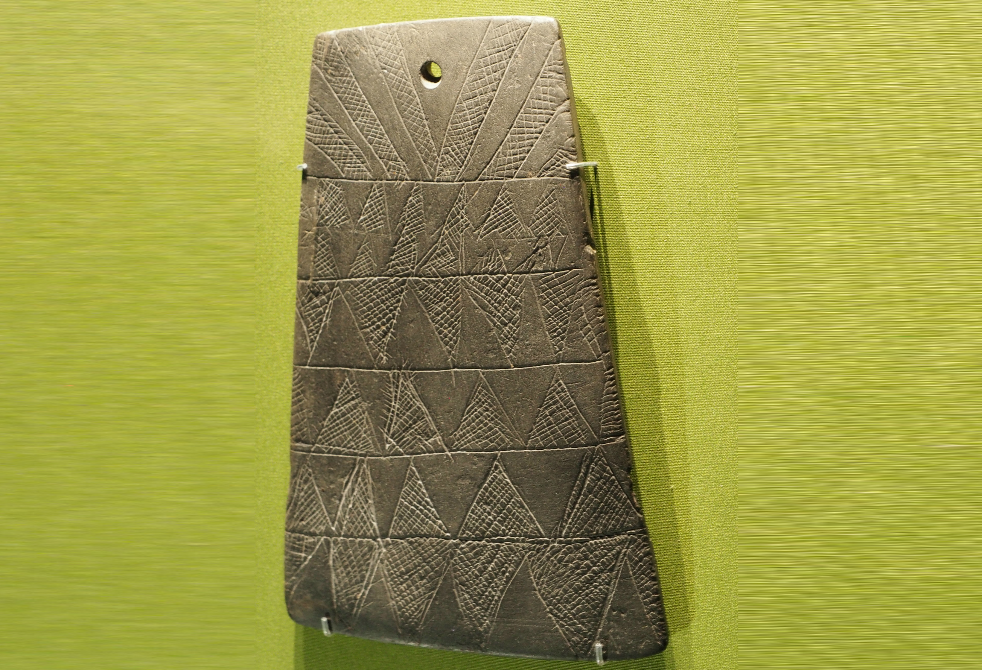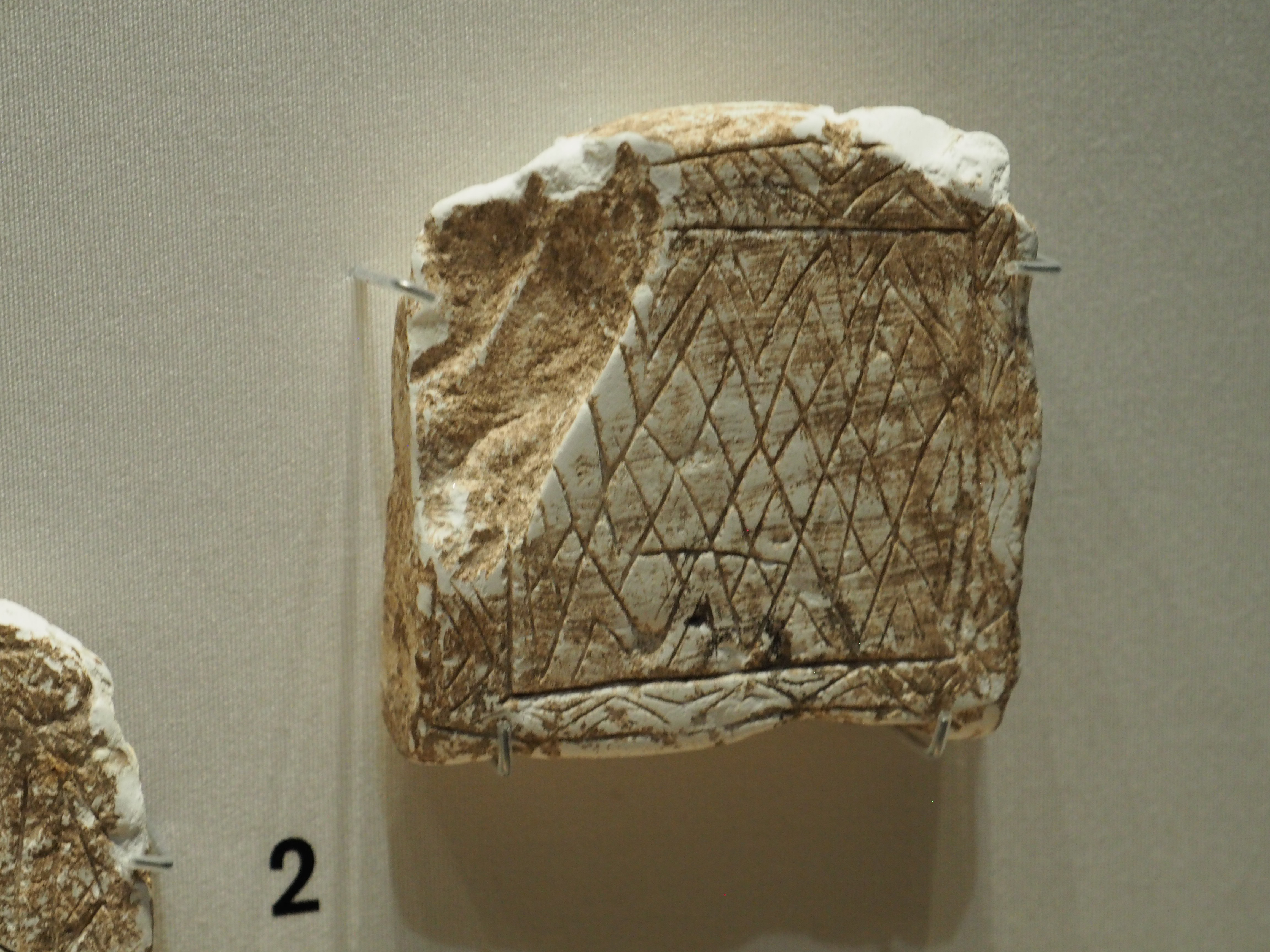 The spiralling rock art of the impressive Brú na Bóinne  chambered tombs in Ireland and the mace-head of Knowth (3,500-3,000 BC) and others (eg. Maesmore, Wales) from around the Irish Sea reveal true artistry.   The chalk drums from Yorkshire (3,000 BC) are remarkable and poignant items (even though we cannot know the complex art’s meaning) that accompanied children’s graves.  On the continent, distinctive Neolithic art appears on the plaques in Portugal and Spain (3,500-2,750 BC).