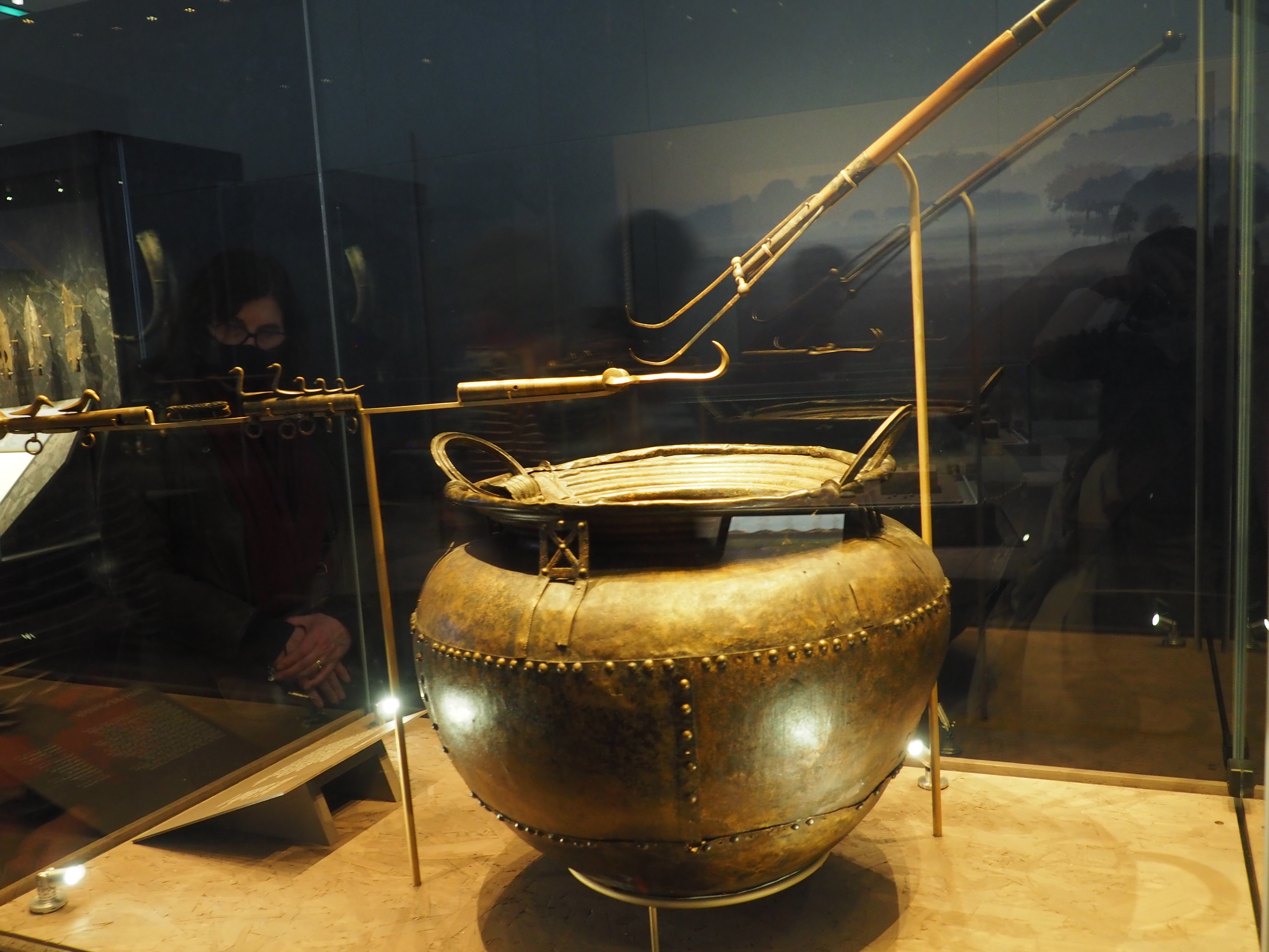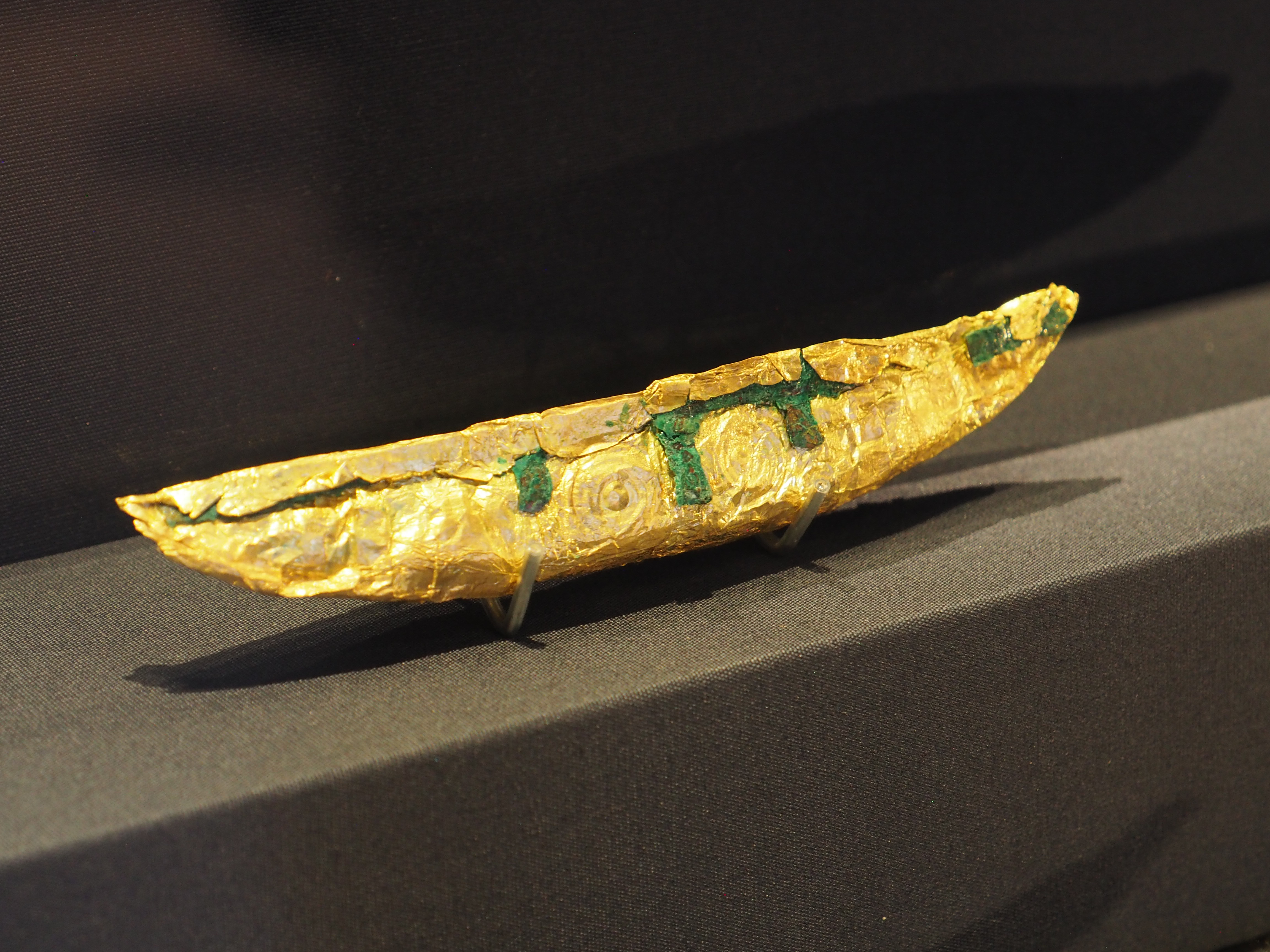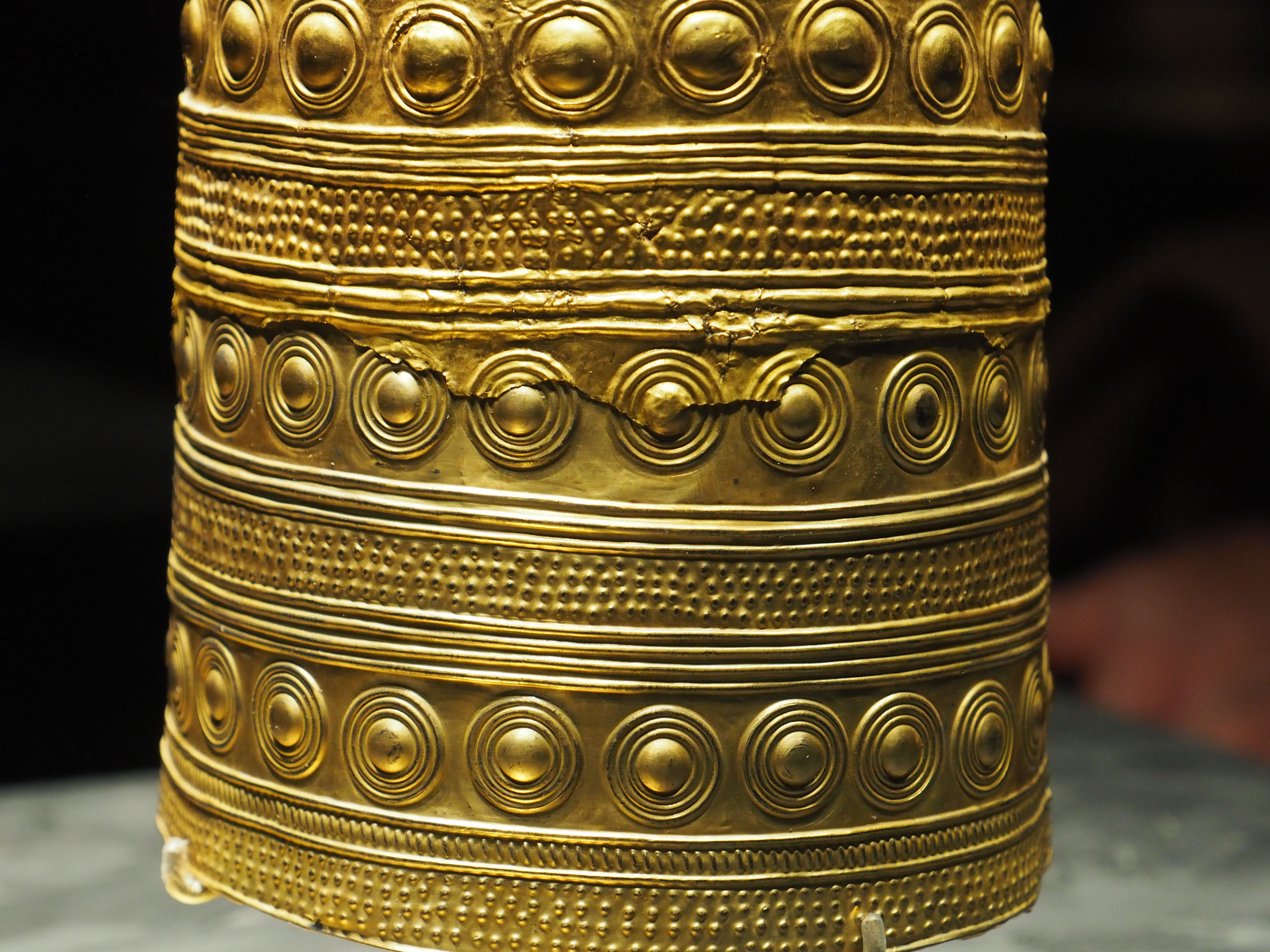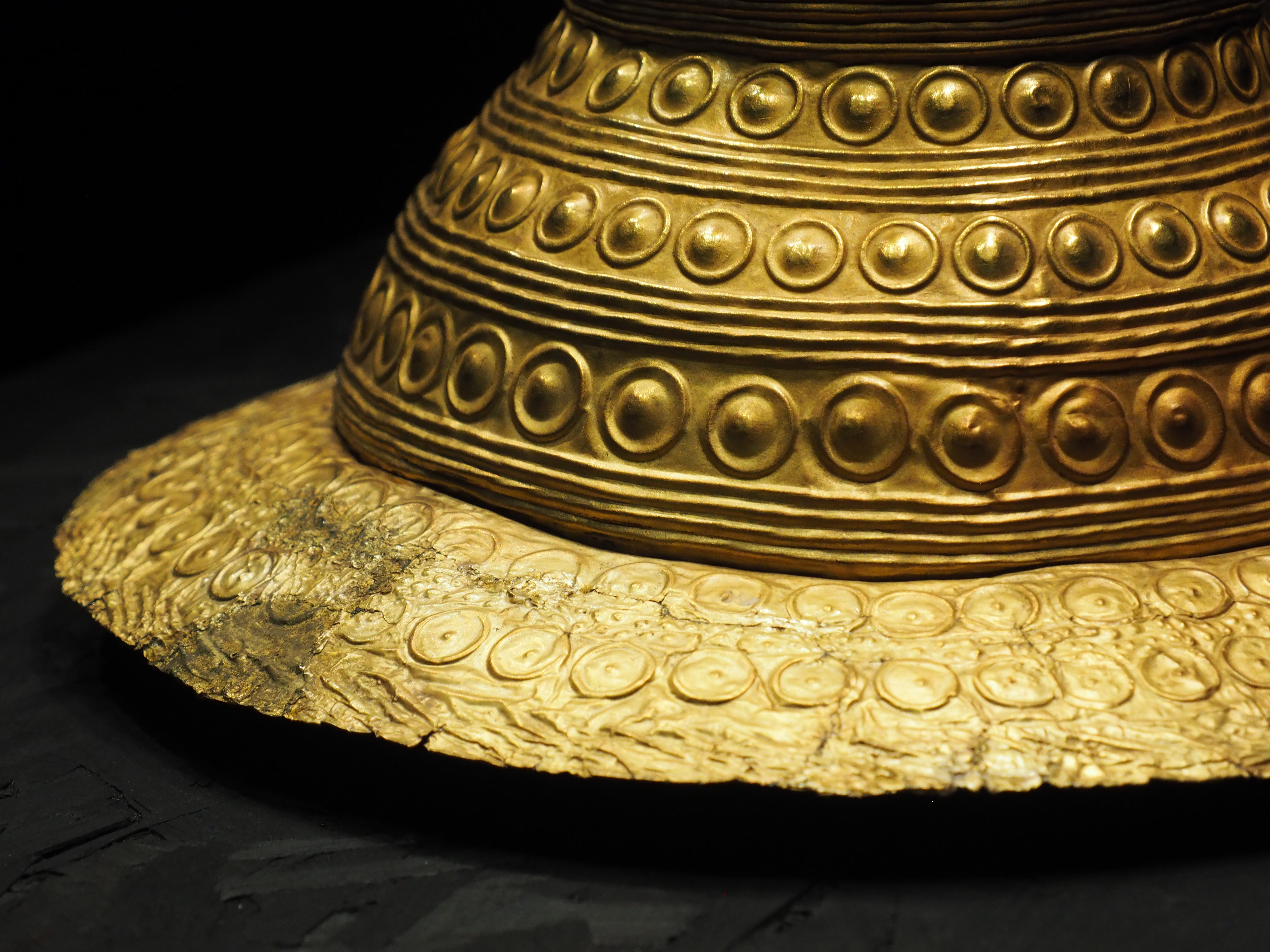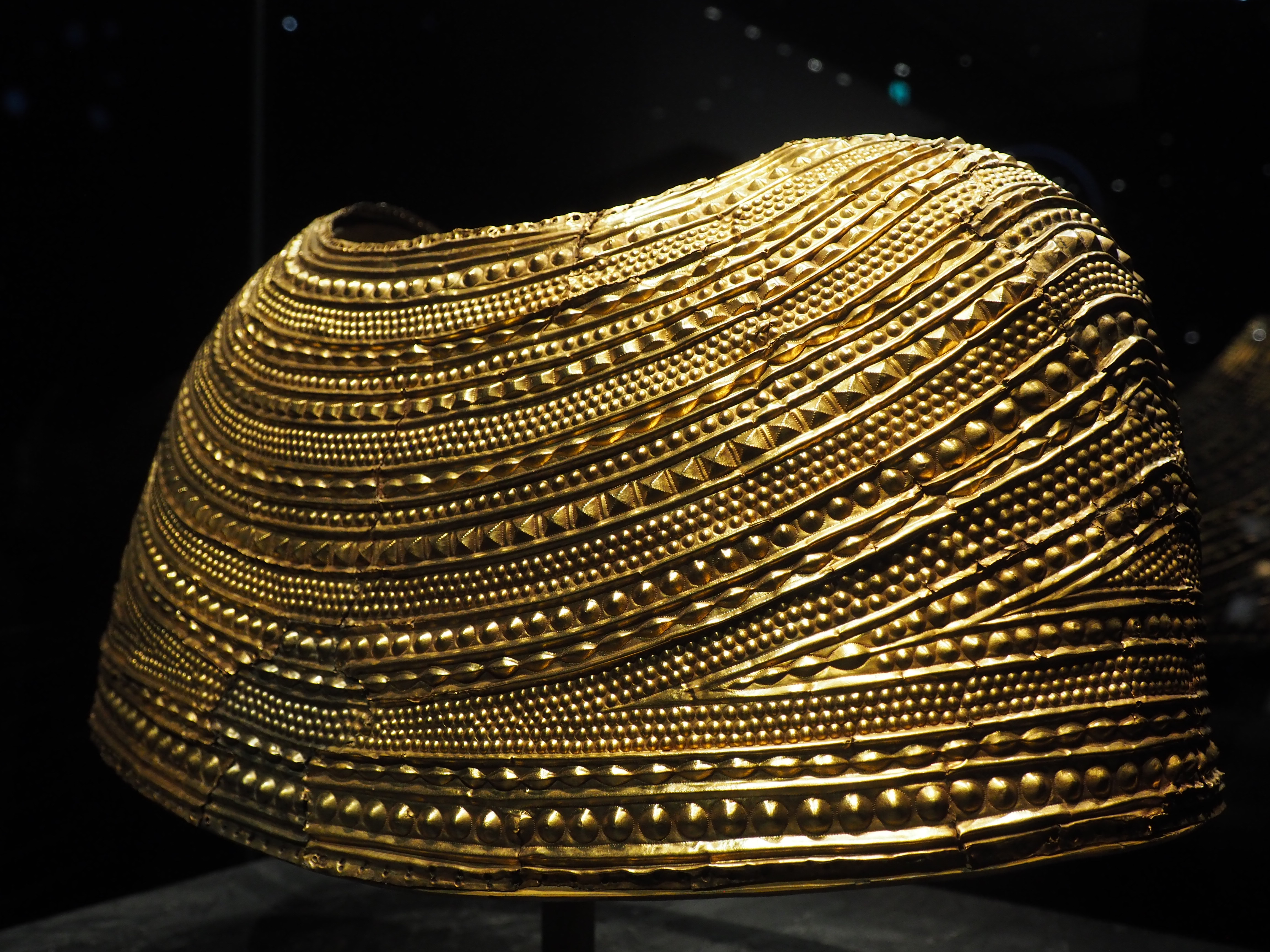 Mythologies of the sun were apparent in Denmark (where fish, birds, horses and snakes propelled the sun on its boat-carried way) and through W.Europe as well as Britain. And shining gold was the obvious material to use to propitiate and represent the bright sun.  It was shaped into stunning cone hats in Germany and France, model (solar?) boats in Denmark and gold belts as votive offerings.