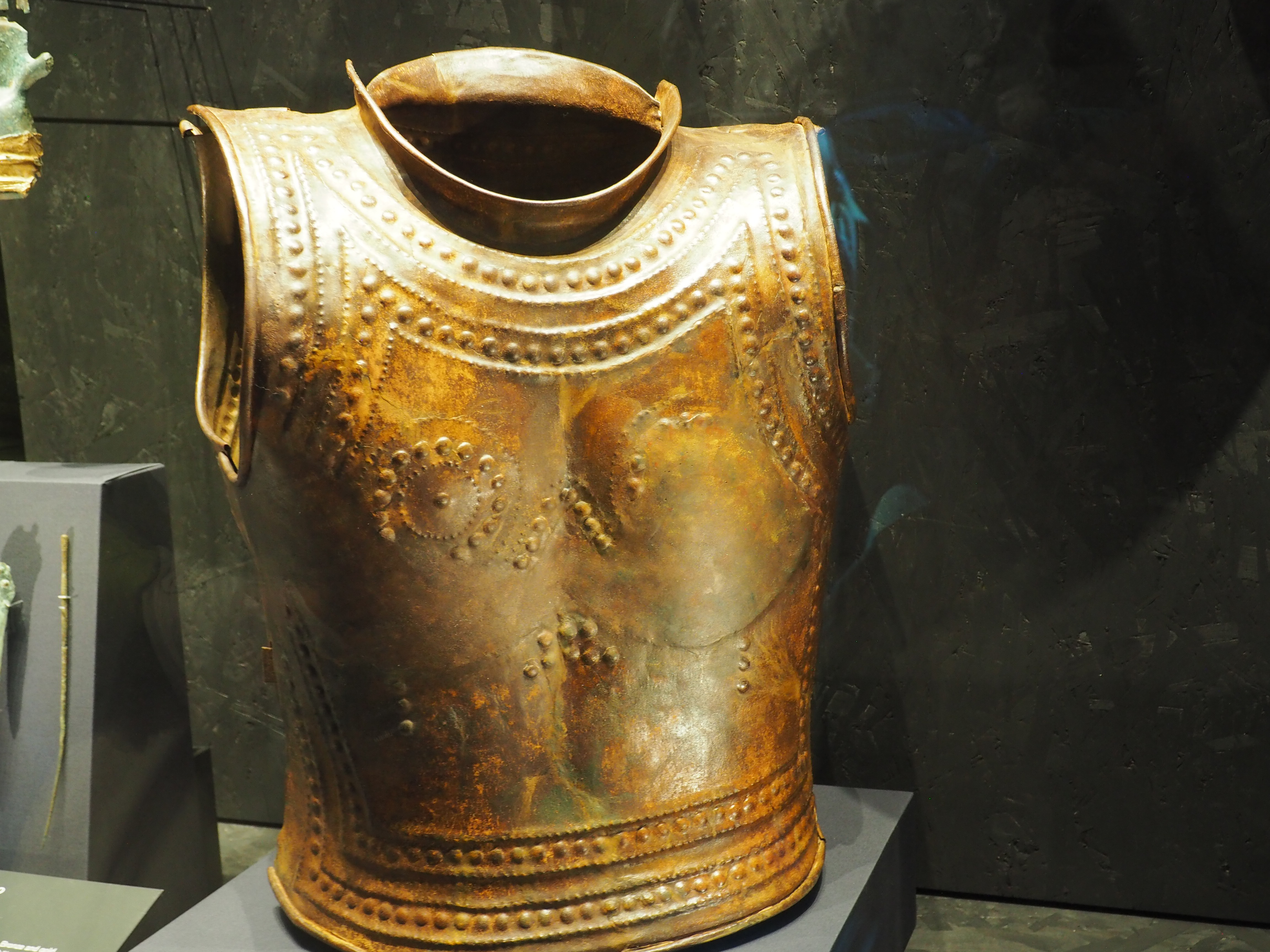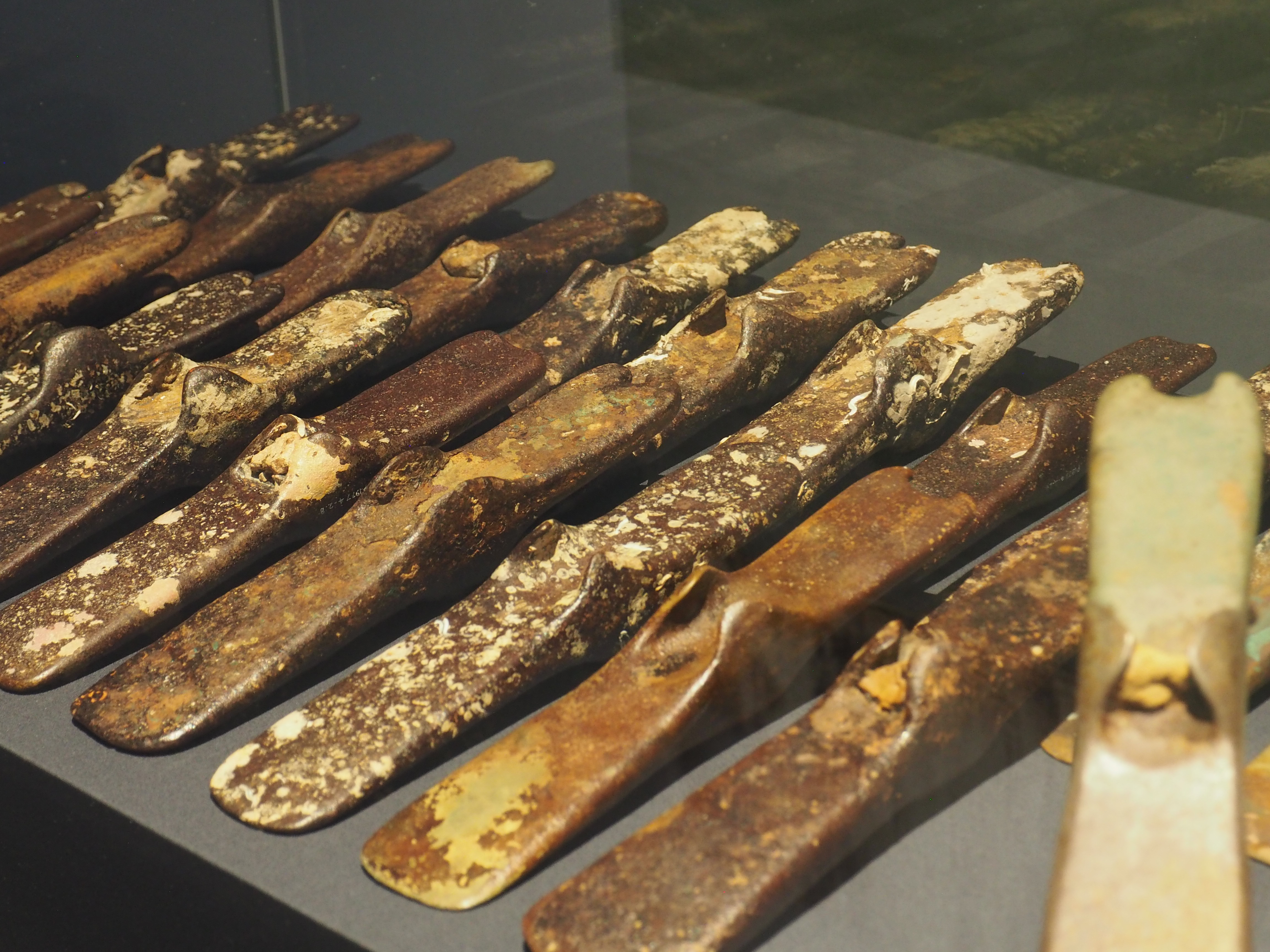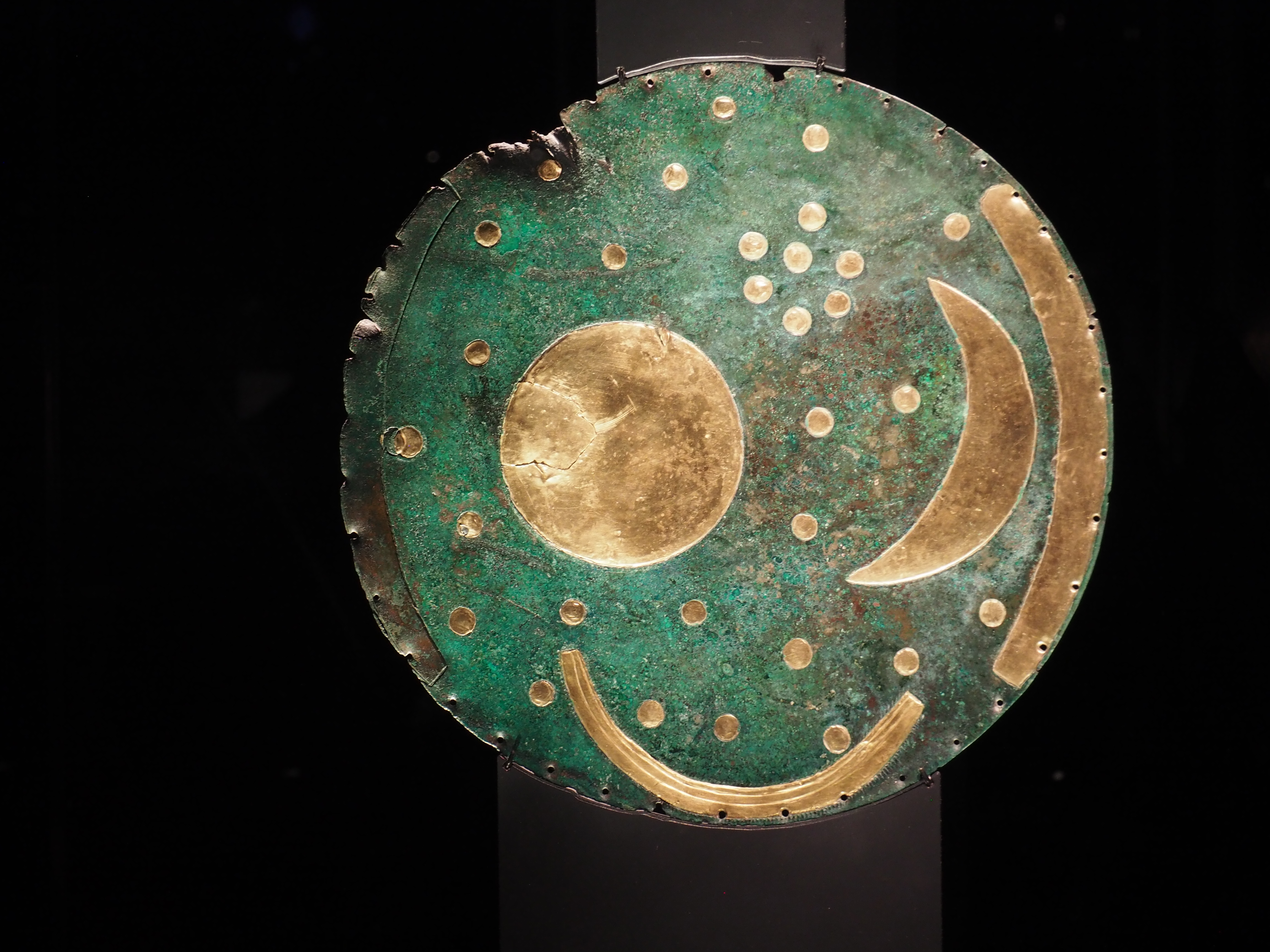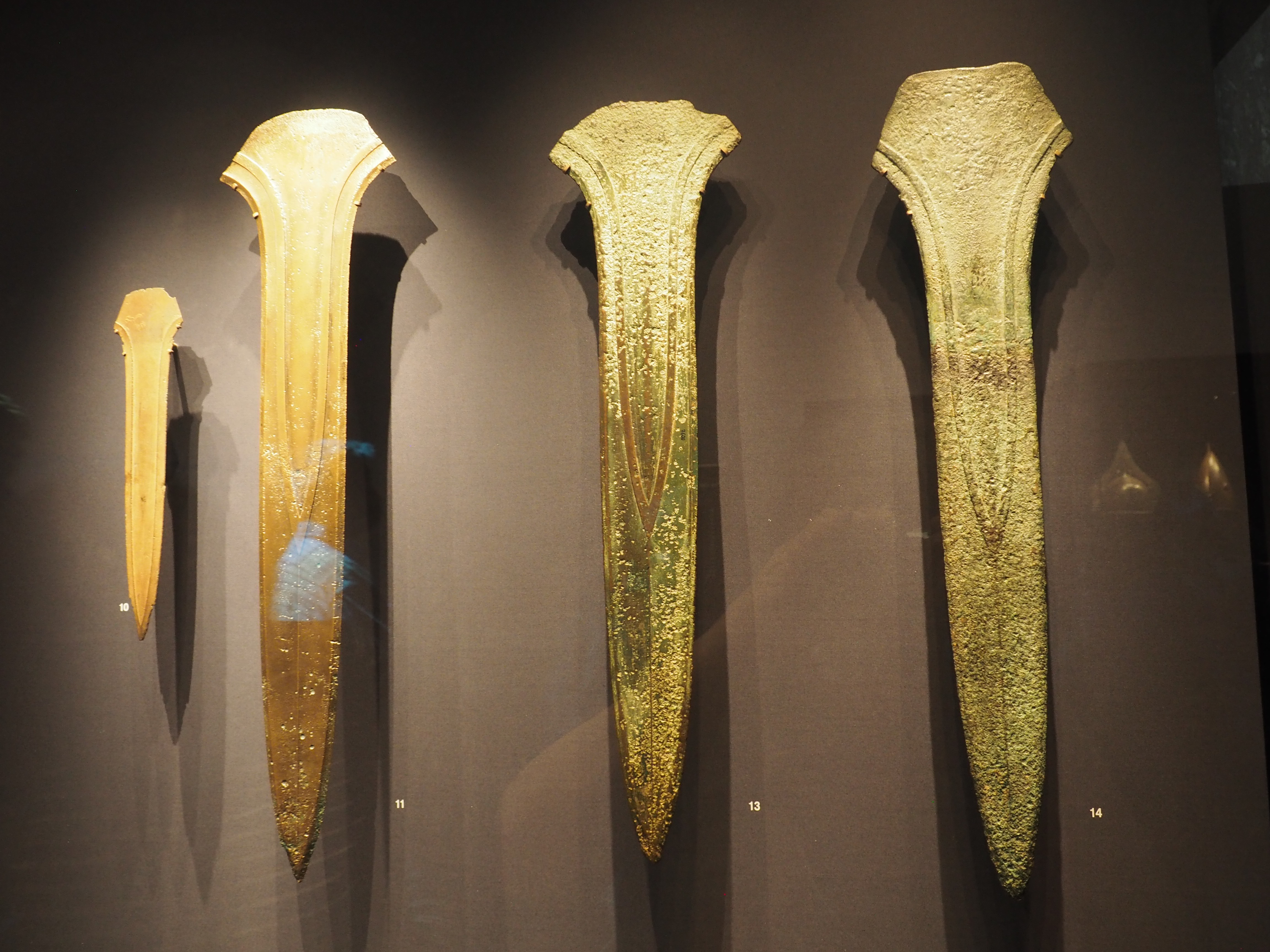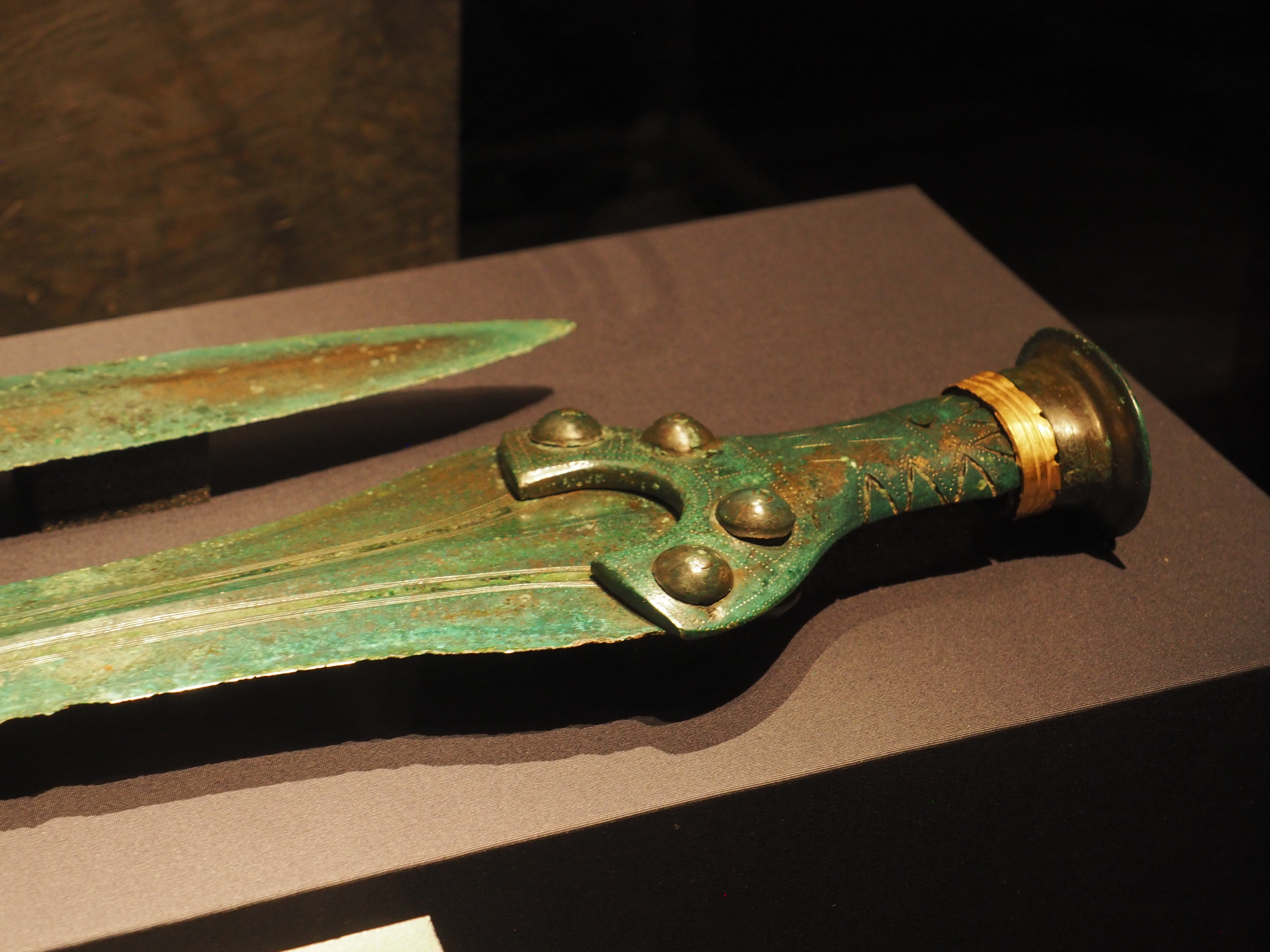 But it wasn’t a time of peace.  Bronze made dedicated weapons of war. While one workshop’s over-sized armour for votive offerings reached England, France and the Netherlands, the Nebra Sky Disc was accompanied by magnificent swords as magnificent bronze battle shields and spears spread.